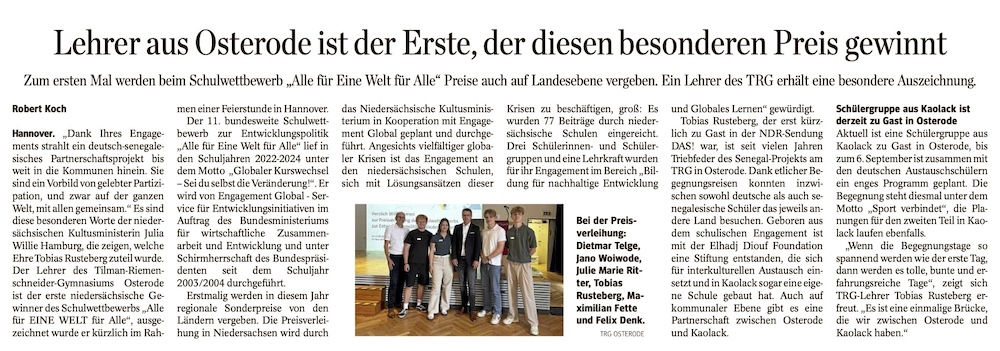Der „Eine Welt für alle“ – Preis wurde 2025 an Tobias Rusteberg und das Senegal-Projekt verliehen. Der Harzkurier berichtet am 30.8.2025 darüber.