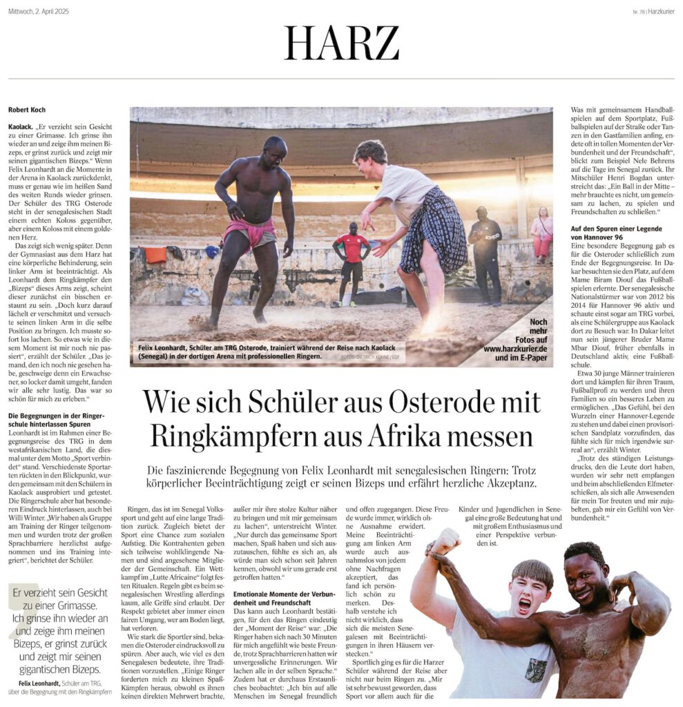 Während der Reise nach Kaolack versuchen sich Schüler des TRGs beim Ringkampf gegen senegalesische Profis. Der Harzkurier berichtet von dieser Begegnung in einem Artikel vom 2.4. 2025.