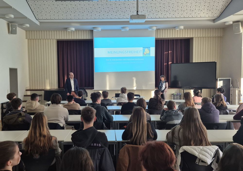 Am 11. Dezember fand zudem ein Vortrag für den Jahrgang 10 zum Thema Meinungsfreiheit statt. Er wurde von Frau Prof. Dr. Sporleder-Geb von der Hochschule Nordhausen gehalten und knüpfte direkt an den Demokratietag an. In ihrem Vortrag vertiefte sie die Bedeutung freier Meinungsäußerung und die Verantwortung jedes Einzelnen im demokratischen Diskurs. Die Schülerinnen und Schüler erhielten dabei wertvolle Impulse, um Meinungsfreiheit im Alltag bewusster wahrzunehmen und zu reflektieren.