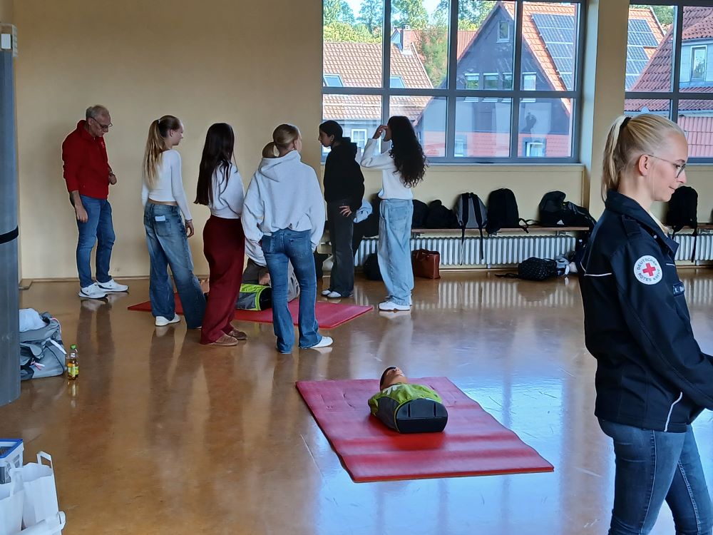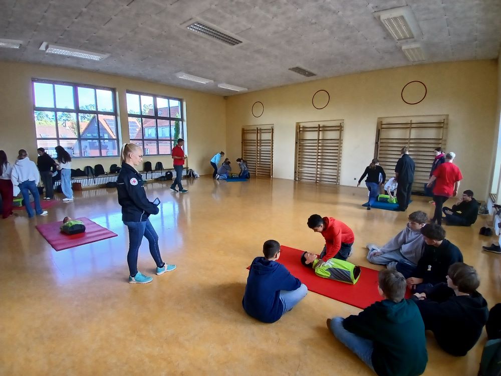 Im Rahmen der bundesweiten Woche der Wiederbelebung nahmen die Schüler*innen des 9. Jahrgangs an einem besonderen Training teil. Mitarbeitende des Deutschen Roten Kreuzes vermittelten wichtige Grundlagen der Ersten Hilfe und übten mit den Jugendlichen die Durchführung von Wiederbelebungsmaßnahmen.