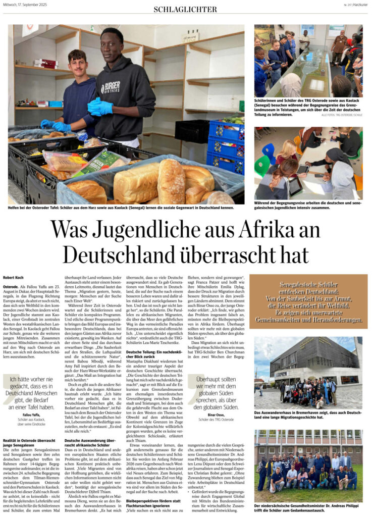 Vom 24. August bis 7. September 2025 waren zehn Jugendliche aus Kaolack (Senegal) gemeinsam mit ihren Lehrern Ousmane Senghor und Djibril Thiam zu Gast an unserer Schule. Im Mittelpunkt stand das Thema Migration. Besuche im Auswandererhaus Bremerhaven, im Grenzlandmuseum Eichsfeld und im Museum Friedland gaben bewegende Einblicke und regten zum Nachdenken an. Inspirierende Begegnungen mit dem Niedersächsischen Minister für Soziales, Arbeit, Gesundheit und Gleichstellung, Dr. Philippi, sowie der Europaabgeordneten Frau Düpont vertieften die Eindrücke.