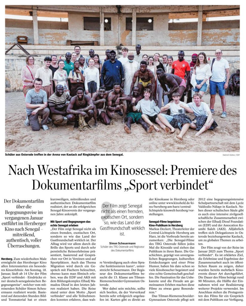 Der Film über die letztjährige Begegnungsreise in den Senegal wird am 18.01.2026 um 14:00 Uhr im Herzberger Kino gezeigt. Bereits am 09.01.2026 berichtet der Harzkurier vorab über das Filmprojekt, das von Simon Scheuermann (Schnitt und Regie) umgesetzt wurde.